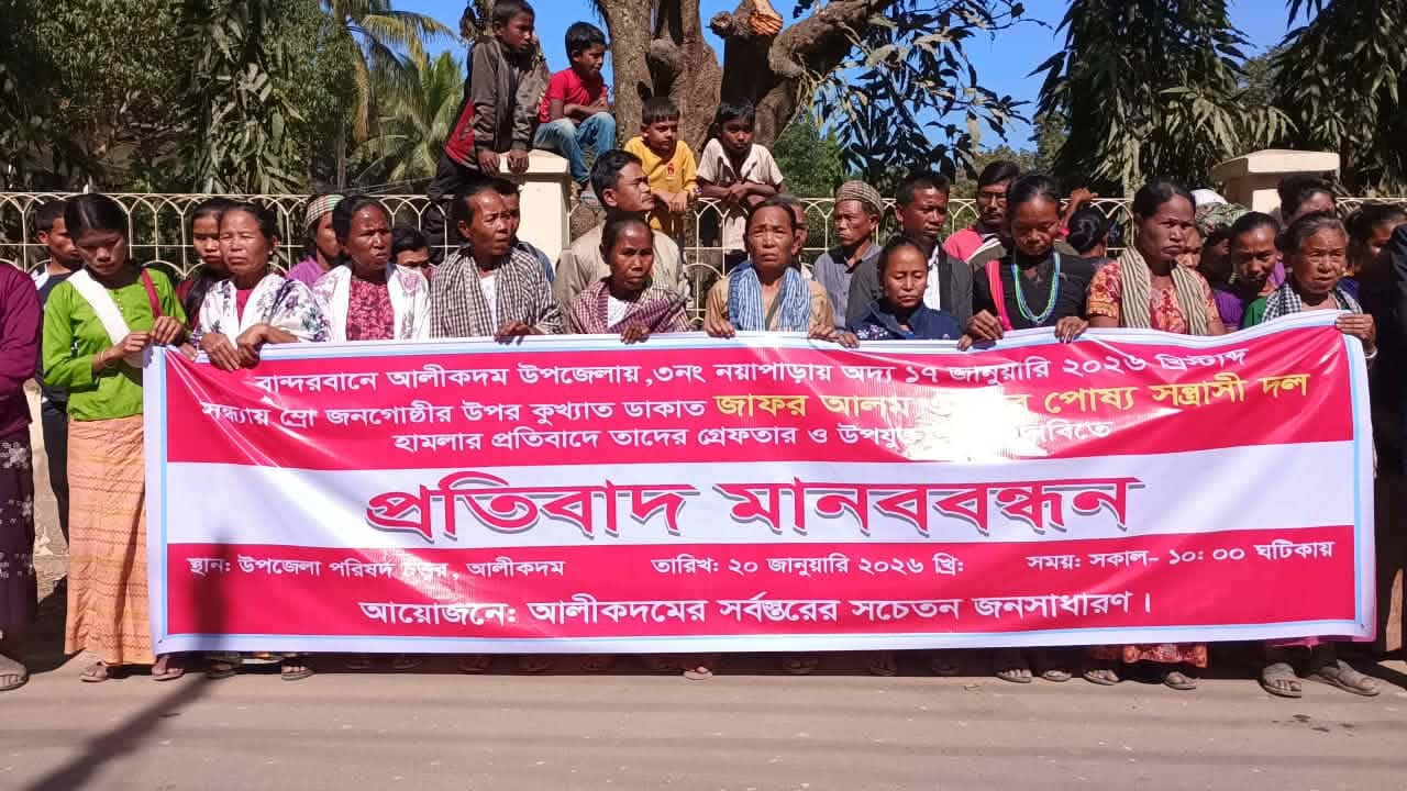 বান্দরবানের আলীকদম উপজেলার ৩নং নয়াপাড়ায় ম্রো জনগোষ্ঠীর ওপর ডাকাত জাফর আলম ও তার সহযোগীদের হামলার প্রতিবাদে মানববন্ধন কর্মসূচি পালন করা হয়েছে।