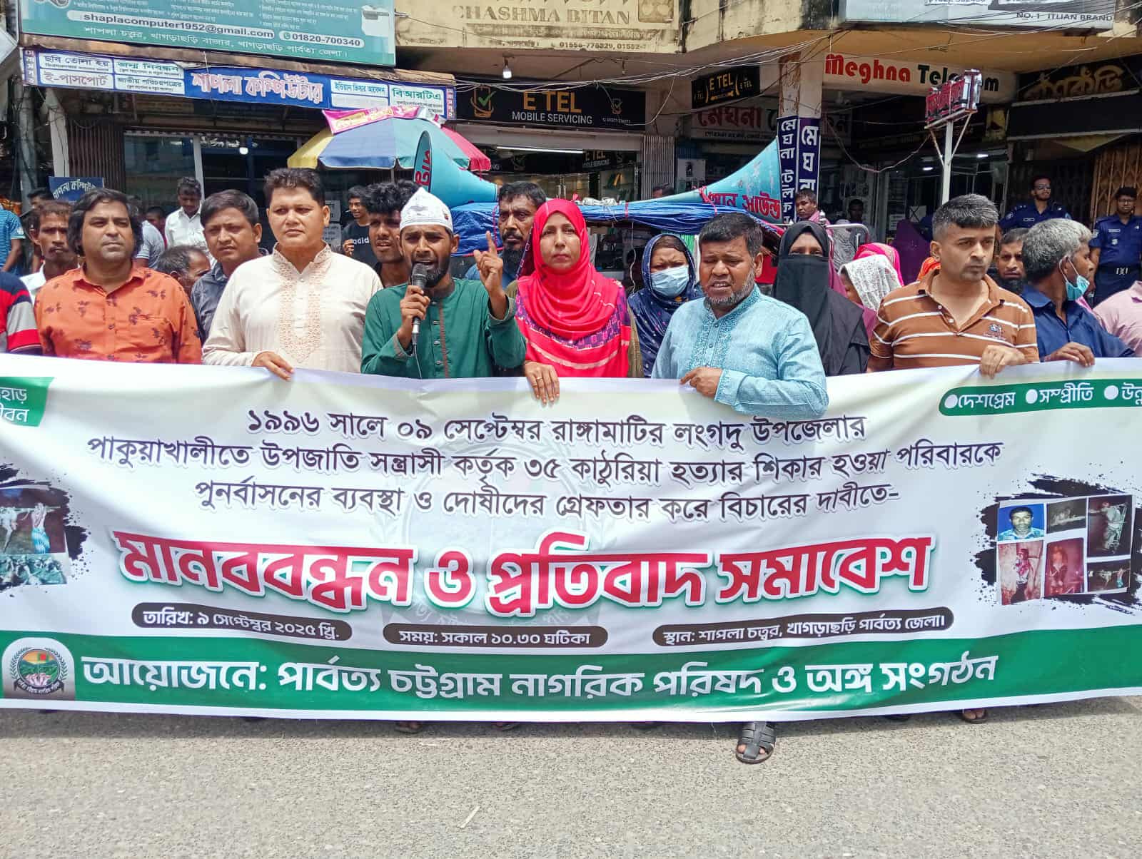 রাঙামাটির পাকুয়াখালীতে ৩৫ জন বাঙালি মুসলিম কাঠুরিয়া,কে নির্মমভাবে হত্যাকাণ্ডের বিচারের দাবিতে মানববন্ধন, প্রতিবাদ সমাবেশ করেছে পার্বত্য চট্টগ্রাম নাগরিক পরিষদ এর খাগড়াছড়ি জেলা শাখার নেতৃবৃন্দরা,১৯৯৬ সালের ৯ সেপ্টেম্বর রাঙামাটির লংগদু উপজেলার পাকুয়াখালীতে ৩৫ জন বাঙালি কাঠুরিয়ার হত্যাকাণ্ড দীর্ঘ তিন দশকেও বিচার হয়নি বলে তারা অভিযোগ করেন।