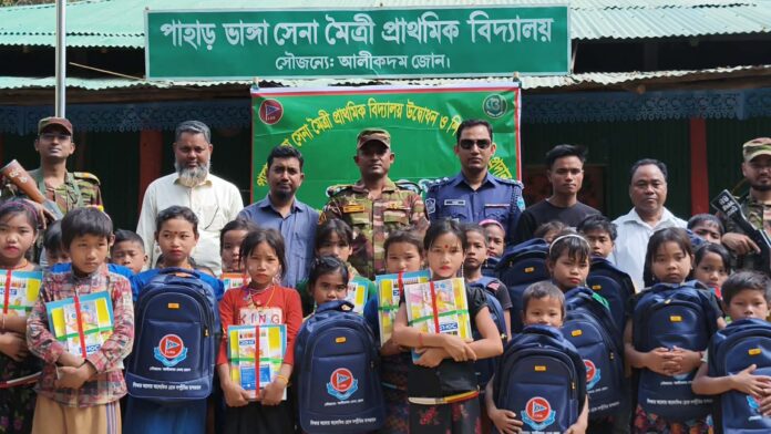 আলীকদম উপজেলা সদর থেকে প্রায় ৬০ কিলোমিটার দূরে এবং মায়ানমার সীমান্ত থেকে মাত্র তিন কিলোমিটার ভেতরে অবস্থিত পাহাড়ভাঙ্গা পাড়া দীর্ঘদিন ধরে শিক্ষা ও স্বাস্থ্যসেবার মতো মৌলিক সুবিধা থেকে বঞ্চিত ছিল। ভৌগোলিক দুর্গমতার কারণে ফাতরাপাড়া, মাসখুম পাড়া ও তরণী পাড়ার শিশুদের জন্য নিয়মিত শিক্ষাগ্রহণ প্রায় অসম্ভব হয়ে পড়েছিল। স্থানীয় জনগণের দীর্ঘদিনের দাবির প্রেক্ষিতে আলীকদম জোন এ অঞ্চলে ‘সেনা মৈত্রী প্রাথমিক বিদ্যালয়’ প্রতিষ্ঠার উদ্যোগ গ্রহণ করে। উদ্বোধন শেষে শিক্ষার্থীদের মাঝে স্কুল ব্যাগ, বেঞ্চ, পাঠ্যবই ও প্রয়োজনীয় শিক্ষা উপকরণ বিতরণ করা হয়।