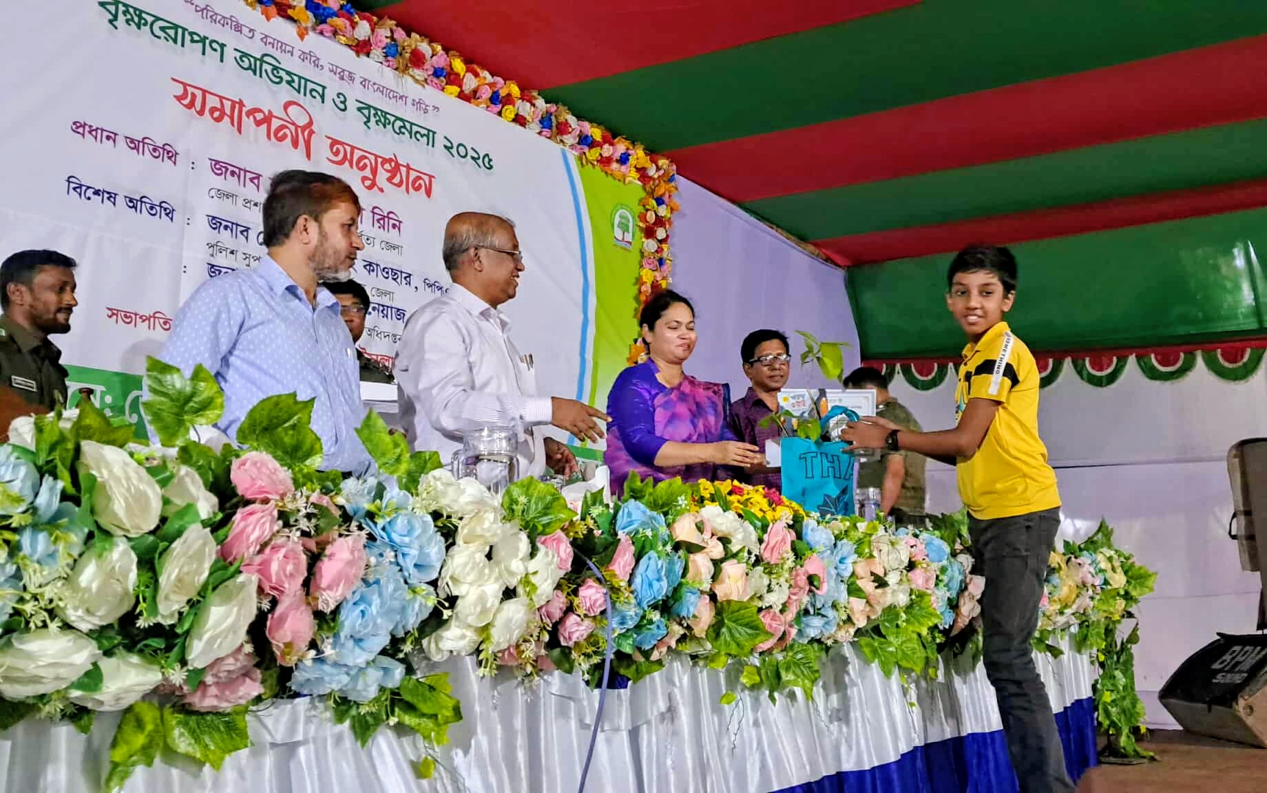 অনুষ্ঠান শেষে বৃক্ষরোপণ ও বৃক্ষমেলায় অংশগ্রহণকারী ও কুইজ প্রতিযোগিতায় অংশগ্রহণকারী শিক্ষার্থীদের মাঝে পুরস্কার, সার্টিফিকেট এবং গাছের চারা বিতরণ করেন জেলা প্রশাসক।