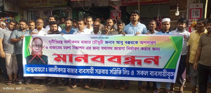 আজ মঙ্গলবার (৯ সেপ্টেম্বর) বিকালে মানববন্ধনে বক্তারা বর্তমান বাজার চৌধুরীর বিরুদ্ধে বিভিন্ন অনিয়ম ও দুর্নীতির অভিযোগ তোলেন। ব্যবসায়ীরা অভিযোগ করেন, চৌধুরী হিসেবে তাঁর কোনো নির্দিষ্ট অফিস নেই এবং তাঁর নিজের কোনো বৈধ ব্যবসা প্রতিষ্ঠান বা প্লটও নেই। বাজারের দীর্ঘদিনের ময়লা নিষ্কাশন সমস্যার প্রতি তার উদাসীনতার কারণে ব্যবসায়ীরা বারবার হয়রানি ও বিব্রতকর পরিস্থিতির শিকার হচ্ছেন বলেও তারা দাবি করেন। বক্তাদের মধ্যে ছিলেন বাজার ব্যবসায়ী সমিতির সভাপতি নজরুল ইসলাম এবং কার্যনির্বাহী সদস্য সাহাব উদ্দিন।