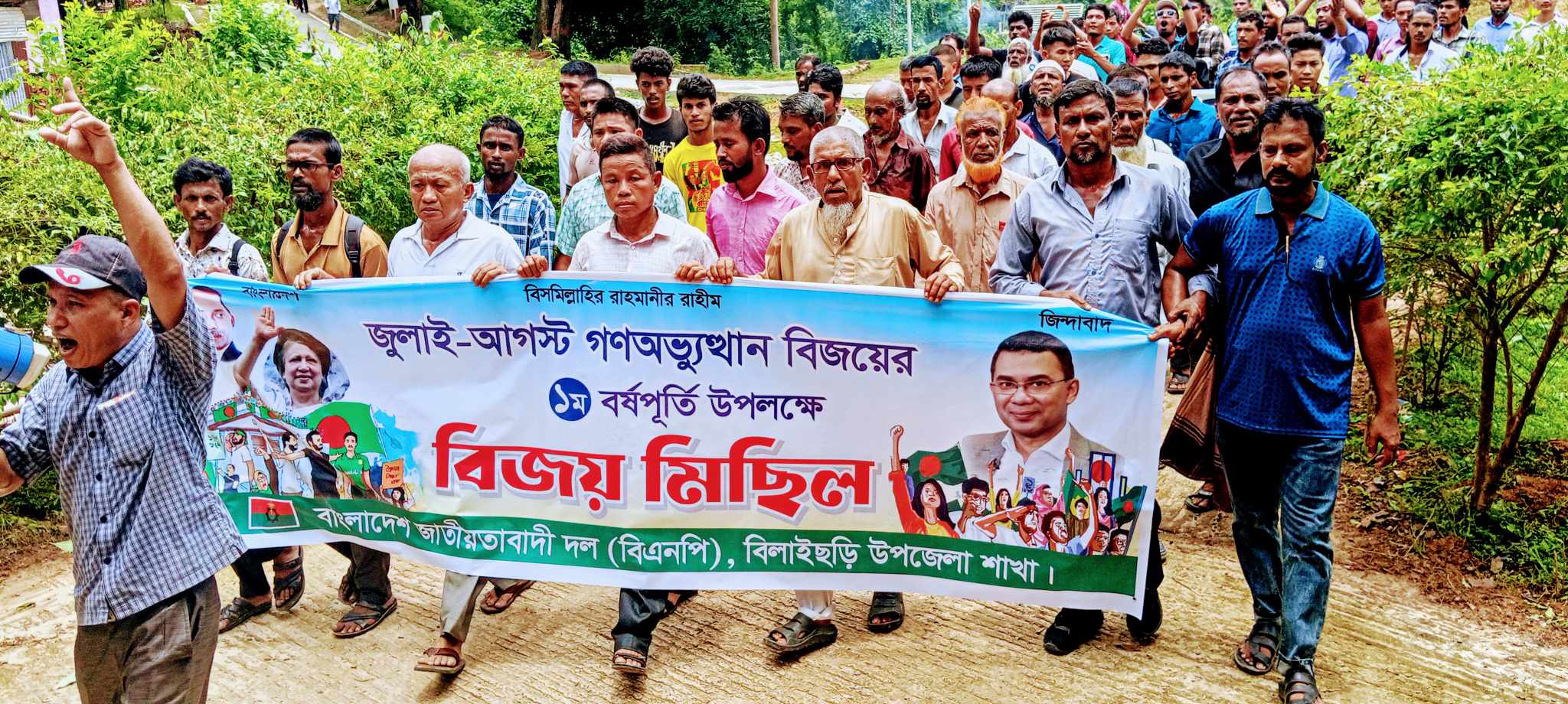 রাঙ্গামাটির  বিলাইছড়িতে জুলাই- আগস্ট গণ-অভ্যুত্থান  বিজয়ের ১ম বর্ষপূর্তি উদযাপন উপলক্ষে বাংলাদেশ জাতীয়তাবাদী দল ( বিএনপি),র বিজয় মিছিল ও  আলোচনা সভা অনুষ্ঠিত হয়েছে। মঙ্গলবার ( ৫ আগস্ট) সকাল১০:৩০ মিনিটে উপজেলা বিএনপি’র আয়োজনে হাসপাতাল ঘাট হতে বাজার  হয়ে ধূপ্যাচর পযর্ন্ত গিয়ে  উপজেলার  প্রধান প্রধান সড়ক প্রদক্ষিণ করে পরে উপজেলা মিলনায়তনে এসে এক সভা অনুষ্ঠিত হয়।