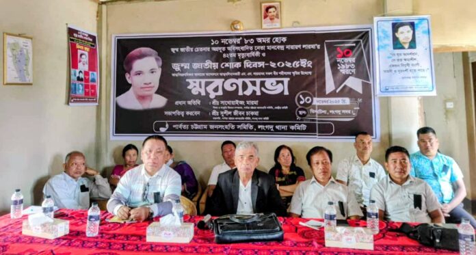 জুম্ম জাতির জাতীয় চেতনার অগ্রদূত মানবেন্দ্র নারায়ণ লারমার ৪২তম মৃত্যুবার্ষিকী ও সকল বীর শহিদের স্মরণে শ্রদ্ধাঞ্জলি জ্ঞাপন করেছে পার্বত্য চট্টগ্রাম জনসংহতি সমিতি (জেএসএস)। সোমবার (১০ নভেম্বর) সকালে সংগঠনটির লংগদু শাখার উদ্যোগে নিজ কার্যালয়ে দিনব্যাপী এই কর্মসূচি অনুষ্ঠিত হয়।