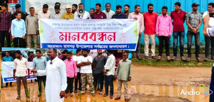 খাগড়াছড়ি -ফেনী আঞ্চলিক মহাসড়কের রামগড় থেকে সোনাইপুল বাজার পর্যন্ত সড়ক সংস্কারের দাবিতে সোমবার (২২ সেপ্টেম্বর )সকালে মানববন্ধন করেছে সচেতন এলাকাবাসী, পৌর শহরের সরকারি উচ্চ বিদ্যালয় এর সামনে সচেতন নাগরিক ব্যানারে এলাকাবাসী এই মানববন্ধন করেন।