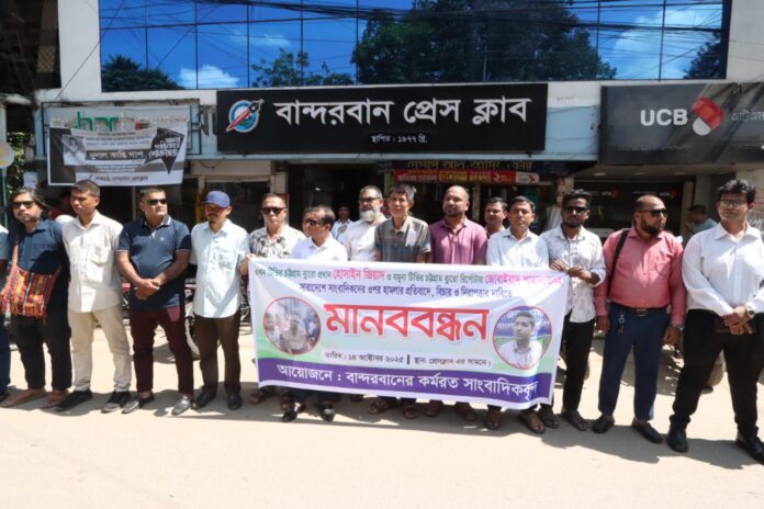 মঙ্গলবার (১৪অক্টোবর) সকালে বান্দরবান প্রেসক্লাব চত্বরে এই মানববন্ধনের আয়োজন করে জেলার সাংবাদিক সমাজ ও বিভিন্ন সামাজিক সংগঠন। এতে জেলার বিভিন্ন প্রিন্ট, অনলাইন ও ইলেকট্রনিক মিডিয়ার সাংবাদিকরা অংশ নেন।