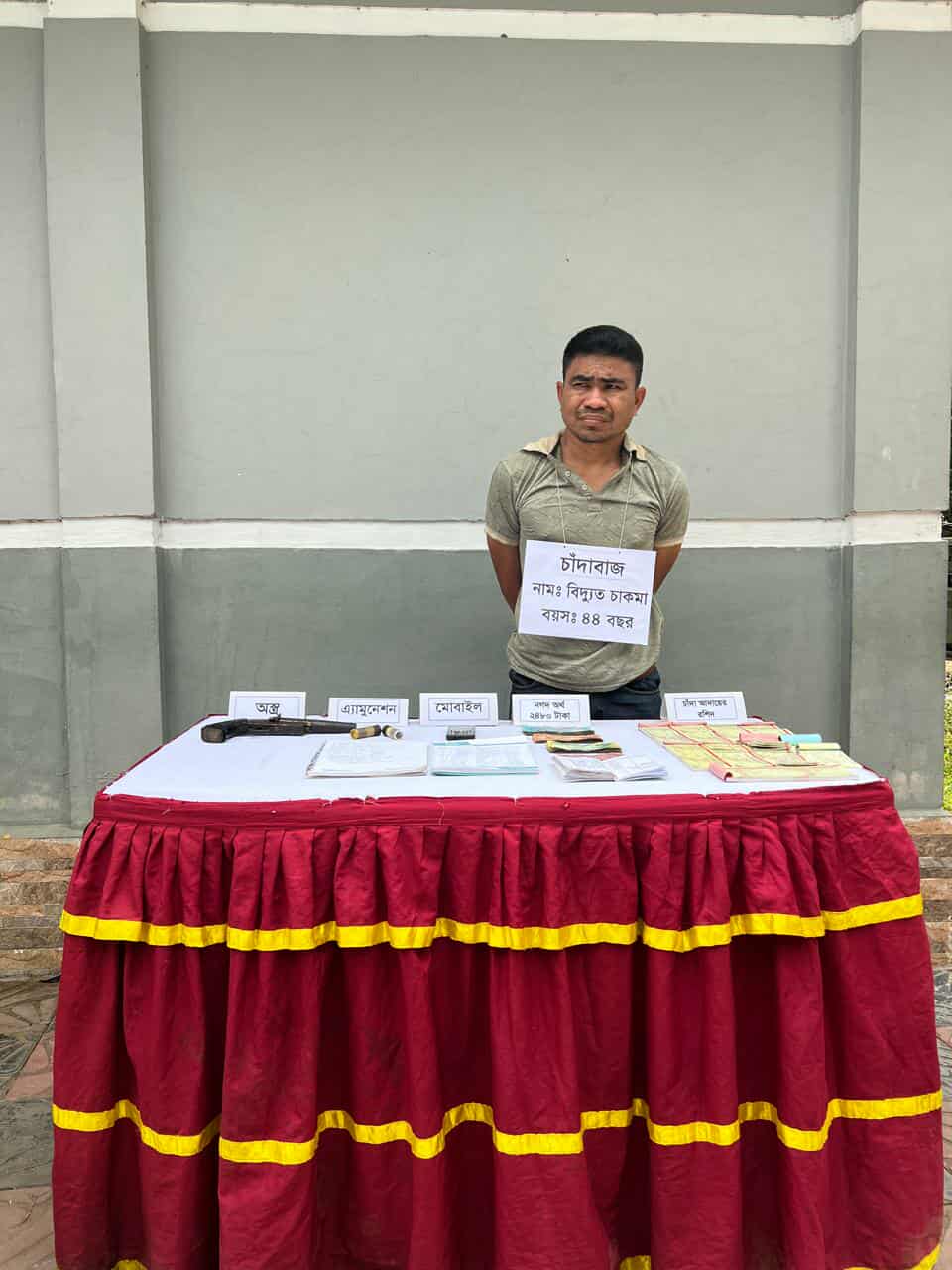 এ সময় তার থেকে ০১টি এলজি অস্ত্র, ০২ রাউন্ড এ্যামোনিশন, ১০টি চাঁদা আদায়ের রশিদ বই, ০১টি মোবাইল সেট, নগদ ২ হাজার ৪ শত ৮০ টাকা এবং ০২টি হিসাবের খাতা জব্দ করা হয়।